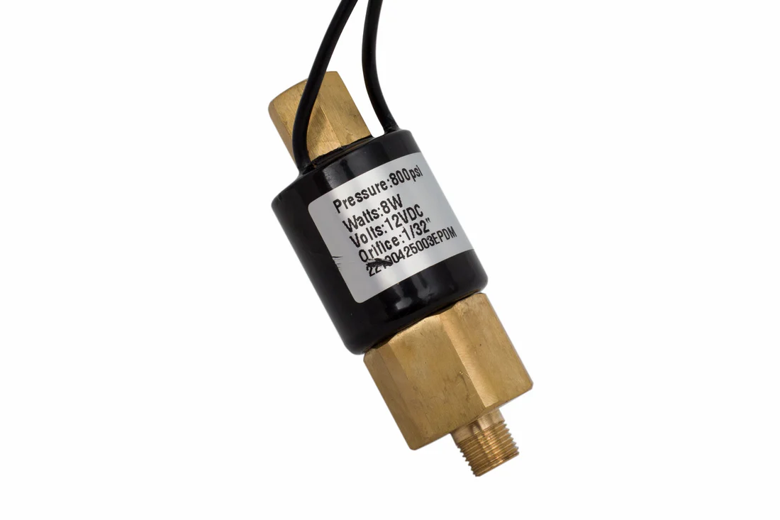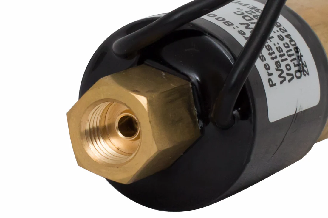 Normally Open Free Backing Electric Solenoid Valve. Commonly found on boat trailers, the solenoid is required if using disc brakes with a surge actuator to prevent locking of the brakes while reversing. This Normally Open Reverse Solenoid operates on a 12 volt capacity and installs with two wires. One wire (either one) connects to tow vehicle reverse lights. One wire (either one) connects to ground. This valve is rated to 800 p.s.i. The solenoid is activated when the tow vehicle is shifted into reverse, powered by the reverse lights. The solenoid then closes the brake fluid port and allows the trailer to back up without locking the trailer brakes by preventing brake fluid from reaching the brakes on the trailer. Male threads (1/8 MTP male pipe threads) screw into back of master cylinder. Female threads (3/16 inverted flare) connect to standard brake line.